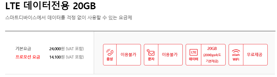 KT엠모바일 LTE데이터전용 20GB 요금제
