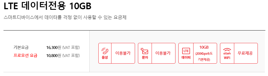 테블릿 전용 요금제이기 때문에 음성 및 문자는 이용불가하고 오로지 데이터만 이용할 수 있으며 월간 10GB의 데이터가 기본으로 제공되며 기본제공량을 다 소진시에는 느린 속도로 인터넷을 사용할 수 있습니다.