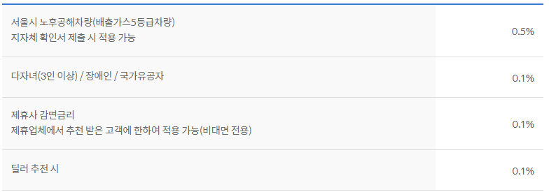 신한은행 중고차 대출의 우대금리는 위와 같으니 참고하여 적용 가능여부를 판단해보시길 바랍니다.