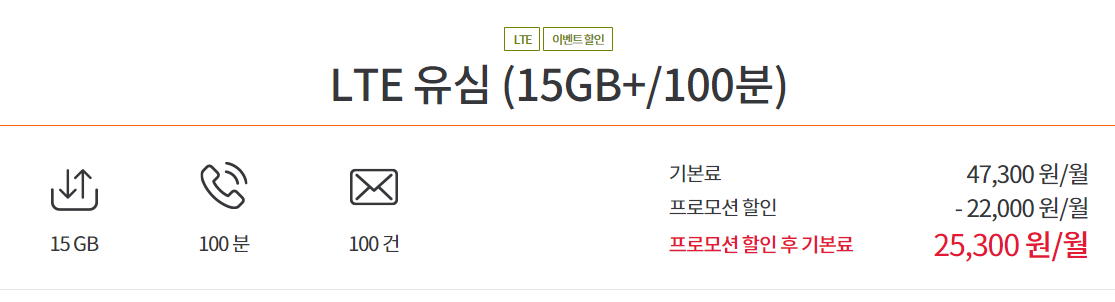 SK 7모바일 LTE 15GB 요금제의 기본료는 47,300원이나 현재는 프로모션 할인기간으로 부가세포함 월 25,300원으로 이용할 수 있습니다.