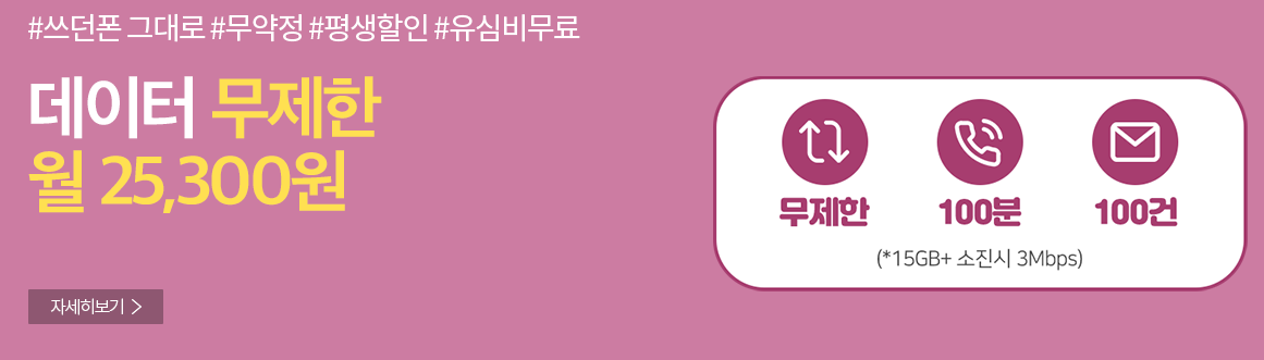 데이터의 경우 월 11GB가 기본으로 제공되며 전량 소진시 매일 2GB의 데이터가 자동충전되며, 이 데이터마저 전량 소진시 속도를 제어하여 무제한으로 인터넷을 이용할 수 있습니다.