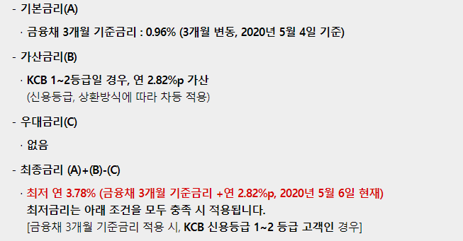 연간 최저 2.82%의 금리가 적용될 수 있지만 본인의 신용등급 및 대출조건 등에 따라 차등 책정될 수 있으니 유의바랍니다.
