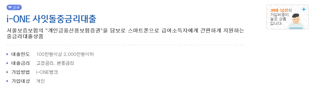 기업은행 사잇돌 중금리대출은 서울보증보험의 "개인금융신용보험증권"을 담보로 스마트폰으로 급여소득자에게 간편하게 지원하는 중금리대출 상품입니다.