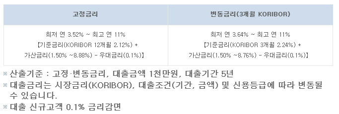 다만 실제 대출금리는 시장금리 및 본인의 대출조건 및 신용등급에 따라 변동될 수 있으니 참고하시길 바랍니다.