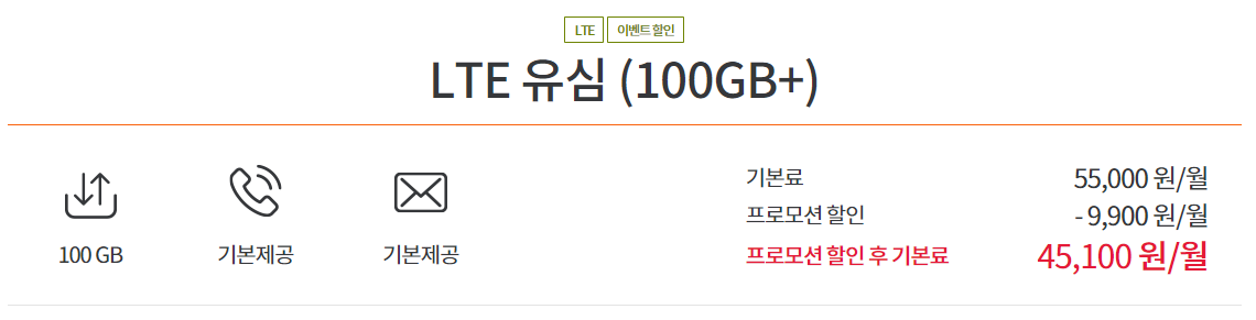 데이터의 경우 매월 100GB가 기본제공됩니다. 100GB를 전량 소진 시 5Mps의 속도로 인터넷을 무제한으로 이용할 수 있으나 영상 및 스트리밍 음악감상을 무제한으로 이용하기에는 조금은 느린 속도이니 참고바랍니다.