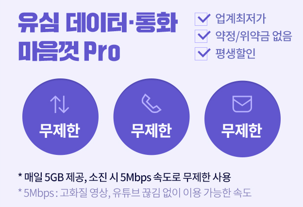 유플러스 알뜰모바일 유심 데이터 통화 마음껏 프로 요금제는 매일 5GB의 데이터를 제공하는 데이터 무제한 요금제입니다. 매일 제공되는 5GB를 당일 전량 소진시 5Mbps의 속도로 무제한 사용할 수 있는 것이 특징입니다. 5Mbps의 속도는 고화질 영상 스트리밍 및 유튜브를 끊김없이 이용가능한 속도이니 참고바랍니다.