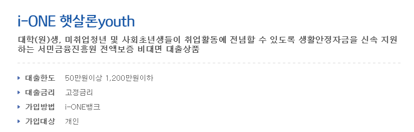 무직자, 대학생, 대학원생, 학점은행제 학습자, 사회초년생등이 신청할 수 있는 대학생, 청년 햇살론으로 평생 1200만원의 한도내에서만 사용가능하고 한도 전량소진시에는 더이상 이용할 수 없는 상품이니 신중하게 사용하시길 바랍니다.