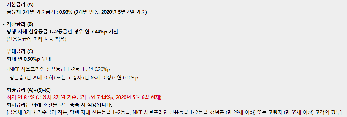 연간 최저 8.1%의 금리부터 적용받을 수 있지만 본인의 신용등급 및 대출조건등에 따라 달라질 수 있다는 점 참고바랍니다.