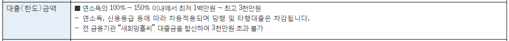 광주은행 새희망홀씨 대출의 한도는 연소득의 100%~150%이내에서 최저 100만원에서 최고 3000만원까지 신청할 수 있습니다.