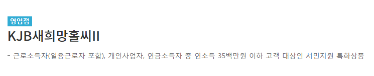광주은행 새희망홀씨는 일용근로자를 포함한 근로소득자, 개인사업자, 연금소득자 중 연소득 3500만원 이하인분을 대상으로 하는 서민지원 특화 대출 상품입니다.