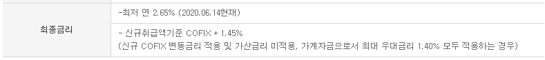 최종금리는 연간 최저 2.65%부터 적용받을 수 있지만 본인의 신용등급 및 가산금리, 우대금리 적용여부에 따라 달라지니 참고하시길 바랍니다.