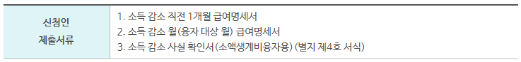 월소득이 직전 달의 월소득에 비해 30%이상 감소한 경우 신청할 수 있으며, 비정규직 근로자 및 특수형태 근로자는 월평균 소득에 관계없이 지원대상이 되니 참고바랍니다.