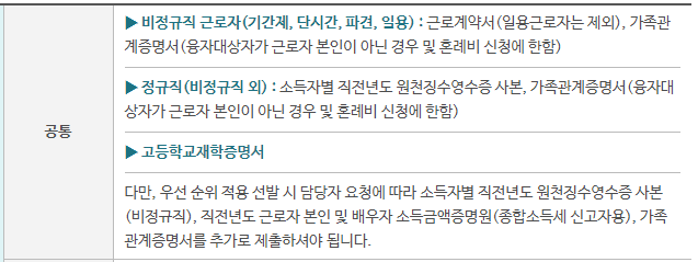 - 비정규직 근로자 : 근로계약서, 가족관계 증명서, 고등학교 재학증명서