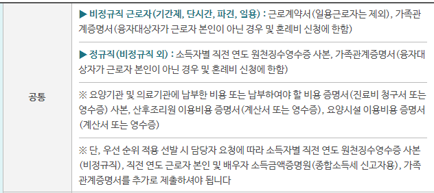 또한 비정규 근로자는 소득요건을 적용하지 않아 월평균 소득이 259만원 이상이어도 신청할 수 있으니 참고하시길 바랍니다.