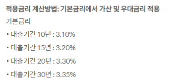 대출만기기간 10년의 경우 3.10%, 15년의 경우 3.20%, 20년의 경우 3.30%, 30년의 경우 3.35%의 금리가 적용되며, 여기에 우대금리를 제하면 최종 금리가 확정됩니다.