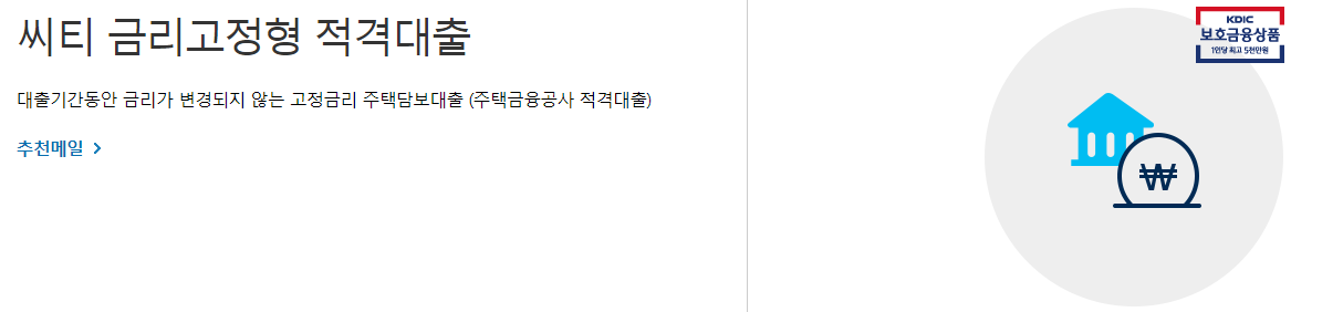 씨티은행에서는 서민들의 내집마련을 위한 정부지원 대출상품인 금리고정형 적격대출을 판매하고 있습니다.
