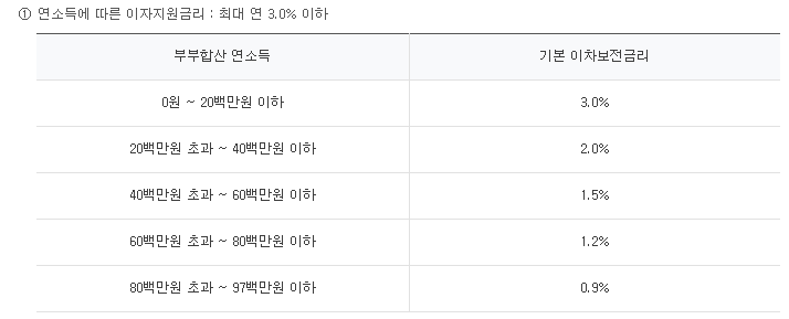 이차보전 지원 금리는 부부합산 연소득에 따라 최대 연 3.0%까지 지원받을 수 있습니다.