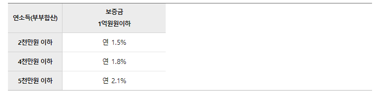 부부합산 연소득 2천만원 이하인 경우에는 연 1.5%, 4천만원 이하인 경우에는 연 1.8%, 5천만원 이하인 경우에는 연 2.1%의 금리가 적용됩니다.