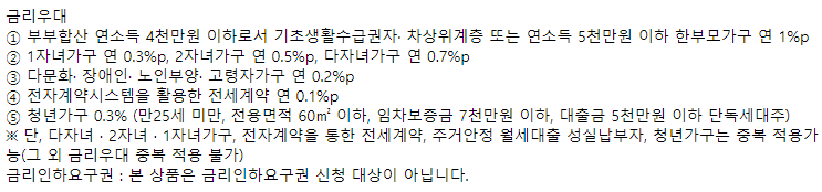 부부합산 연소득으로 결정된 금리에 위의 우대금리를 차감하여 실제 금리가 산정되니 보다 자세한 금리는 우리은행 영업점으로 문의하시길 바랍니다.