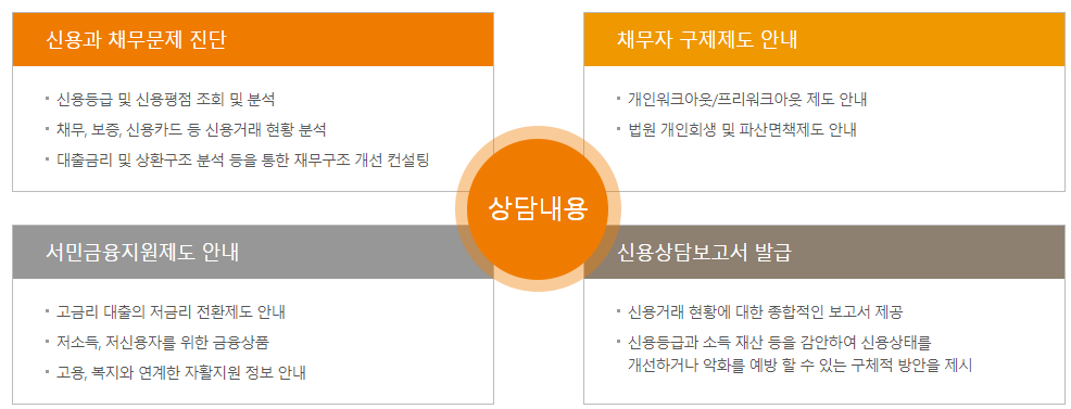 정식명칭은 신용회복위원회이며, 신용과 채무문제 진단, 채무자 구제제도 안내, 서민금융지원, 신용상담보고서 발급등의 업무를 진행하고 있습니다.