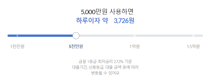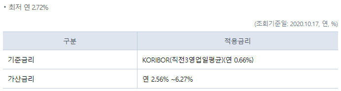 최저 연 2.72%의 금리부터 적용받을 수 있으며, 본인의 신용등급 및 대출금액 등에 따라 개인별 차등 적용됩니다.