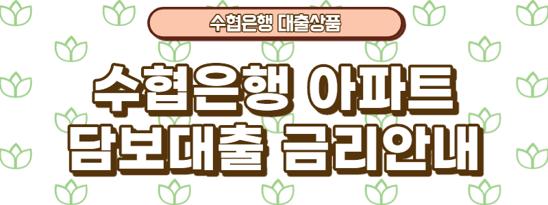 이번 시간에는 수협은행 아파트 담보대출의 특징안내, 신청자격, 대출한도, 상환기간, 대출금리, 필요서류 등에 대해 알려드리도록 하겠습니다.