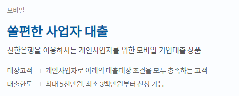 신한은행에서는 신한은행을 이용하는 개인사업자의 사업운영자금 및 시설자금 등을 지원하기 위한 사업자 전용 대출상품을 판매하고 있습니다.