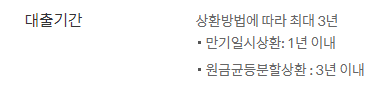 원금균등분할상환의 경우 3년 이내로 대출기간을 선택할 수 있으며, 한번 결정된 상환기간은 대출실행 이후에는 변경할 수 없으니 신중히 결정하시길 바랍니다.