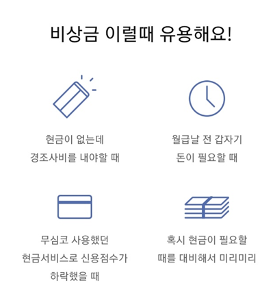 갑자기 현금이 필요할 때, 무심코 사용했던 현금서비스로 신용점수가 하락했을 때, 지인에게 돈을 빌려달라고 이야기 어려울 때 사용하기 좋은 대출 상품입니다.