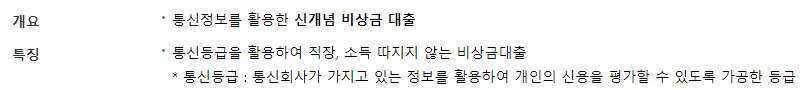 통신등급을 활용하여, 재직 유무 및 소득증빙을 할 수 없는 분도 이용할 수 있는 대출 상품입니다.