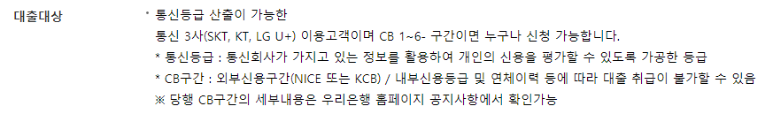 우리은행 비상금대출은 통신등급을 산출할 수 있는 통신 3사(SKT, KT, LGU+)를 이용하고 계신 분이 신청할 수 있습니다.
