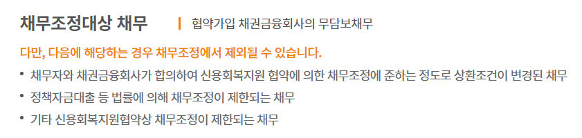 다만 채무자와 채권금융회사가 합의하여 신용회복지원 협약에 준하는 정도로 상환조건이 변경된 채무 및 정책자금대출 등 법류에 의해 채무조정이 제한되는 채무는 포함할 수 없으니 유의바랍니다.