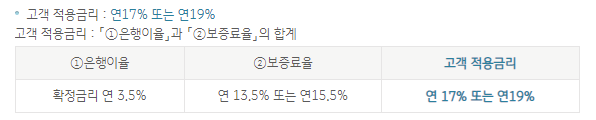 연간 17% 또는 연 19% 중 하나로 결정되며, 국민은행이 수취하는 금리는 연 3.5%, 국민행복기금에서 수취하는 보증료율이 연 13.5% 또는 연 15.5%이니 참고바랍니다.