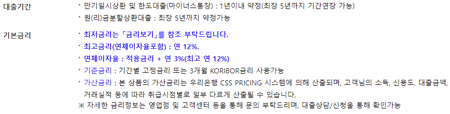 우리은행 첫급여 신용대출 상환기간은 만기일시상환 또는 마이너스 통장 대출일 경우 최대 1년으로 약정되며 만기전 연장신청을 통해 최대 5년까지 연장하여 이용할 수 있습니다.