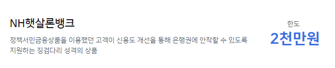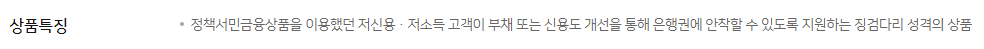 농협은행에서는 정부에서 지원하는 정책서민 금융상품을 이용했던 분이 신용도 개선을 통해 은행원에 안착할 수 있도록 지원하는 징검다리 성격의 대출 상품을 취급하고 있습니다.