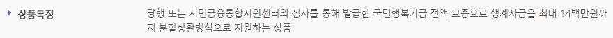 기업은행 또는 서민금융통합지원센터의 심사를 통해 발급한 국민행복기금 전액 보증으로 생계자금을 최대 1400만원까지 분할상환방식으로 지원하고 있습니다.