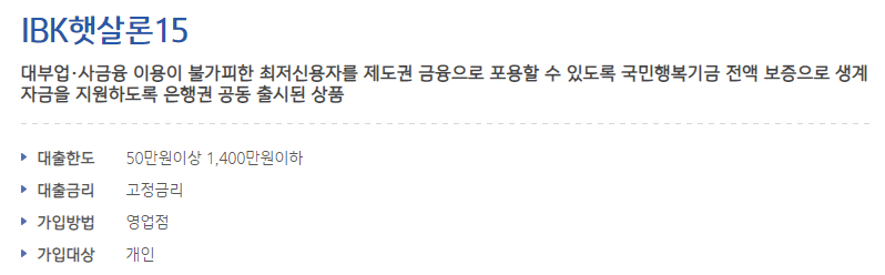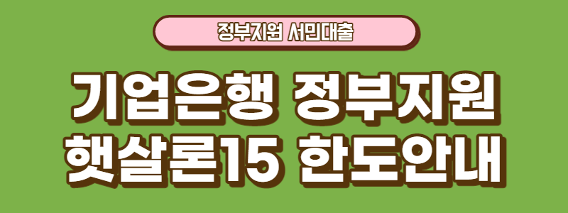 기업은행 햇살론15는 제도권 금융상품을 이용할 수 없는 상황에서 어쩔 수 없이 고금리 대출을 이용할 수 밖에 없는 분들을 지원하게 위해 만들어진 정부지원 고금리 대안대출 상품입니다.