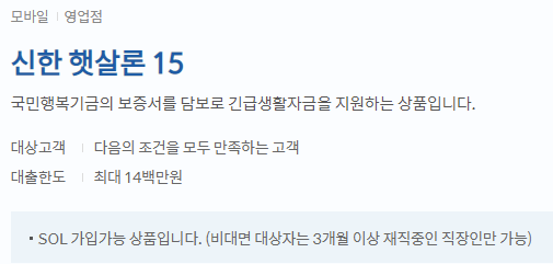 신한은행 서민대출 햇살론15는 국민행복기금의 보증서를 담보로 긴급생활자금을 지원하는 대출 상품입니다.