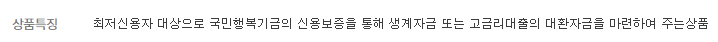 신용점수가 낮고 소득이 적어 어쩔 수 없이 고금리 대출을 이용할 수 밖에 없는 분들을 지원하기 위해 만들어진 대출 상품으로 대출금리가 다른 서민대출에 비해 높다는 점이 특징입니다.