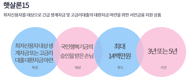 하나은행 햇살론15는 최저신용자를 대상으로 긴급 생계자금 및 고금리 대출의 대환자금을 지원하는 대출 상품입니다.