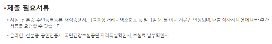 지점에 방문하여 신청할 경우 신분증 및 주민등록등본, 재직증명서, 급여통장 거래내역조회표가 필요합니다.