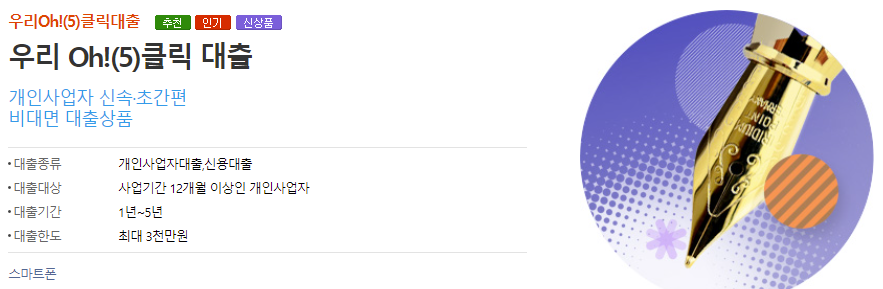 우리은행에서는 개인사업자 및 소상공인이 편리하게 이용할 수 있도록 대출 신청 절차를 간소화한 소상공인 전용 비대면 신용대출 상품을 취급하고 있습니다.