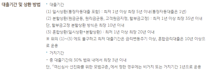 분할상환의 경우 총 대출기간의 30% 범위내에서 최장 3년 이내로 거치기간을 부여할 수 있으니 참고바랍니다.