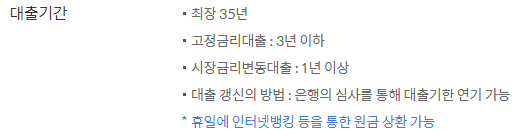 다만 고정금리로 대출을 하는 경우 대출기간은 3년 이하로 결정되며, 변동금리 대출로 신청하는 경우 1년이상 35년 이하로 대출기간을 결정할 수 있습니다.