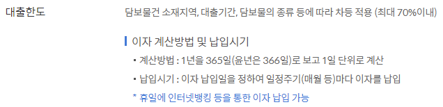 담보물건의 소재지역, 대출기간, 담보물의 종류 등에 따라 실제한도는 달라질 수 있으니 보다 자세한 한도상담은 신한은행 영업점으로 문의하시길 바랍니다.