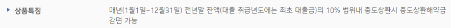 소득요건과 무주택 요건이 없고 매년 전년말 대출잔액의 10% 범위내 중도상환시 중도상환해약금을 감면 받을 수 있다는 것이 특징입니다.