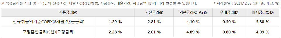 다만 위의 금리는 참고용이며, 실제 금리는 대출을 신청하시는 분의 개인신용평점 및 대출금액에 따라 개인별 차등 적용됩니다.