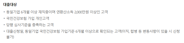 국민건강보험에 직장인 자격으로 가입되어 있어야 하며, 국민건강보험 납부보험료로 추정한 소득이 연 2000만원 이상이어야 대출 신청이 가능하니 참고하시길 바랍니다.