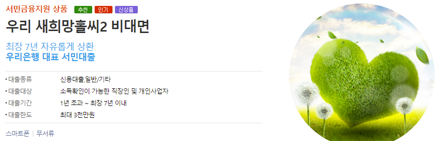우리은행 새희망홀씨는 서민금융 지원을 위한 정부지원 서민대출 상품입니다.