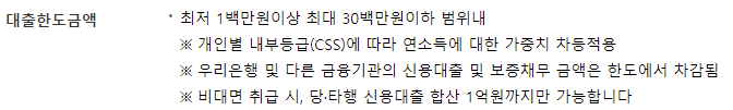 대출을 신청하시는 분의 개인 신용평점 및 연소득에 따라 한도는 개인별 차등 책정됩니다.